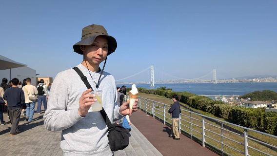 途中で休憩を兼ねて淡路島のサービスエリアでソフトクリームを食しご満悦です。