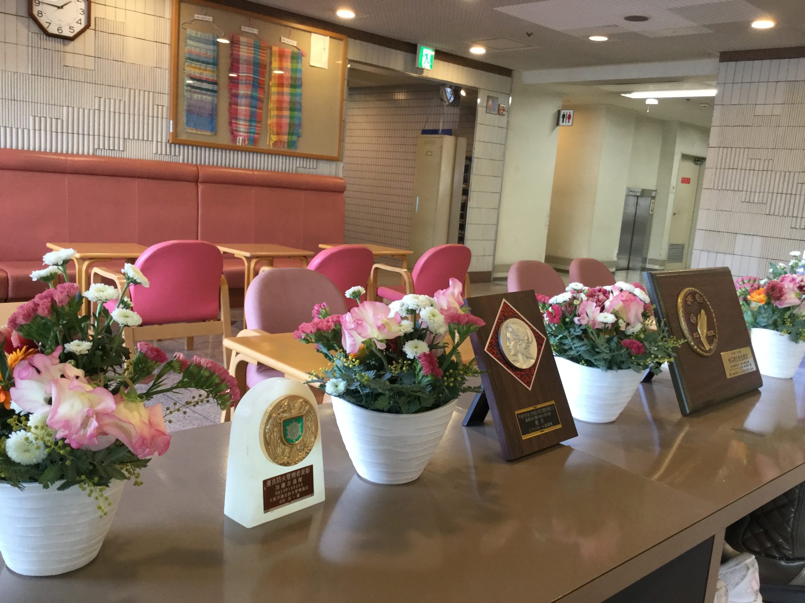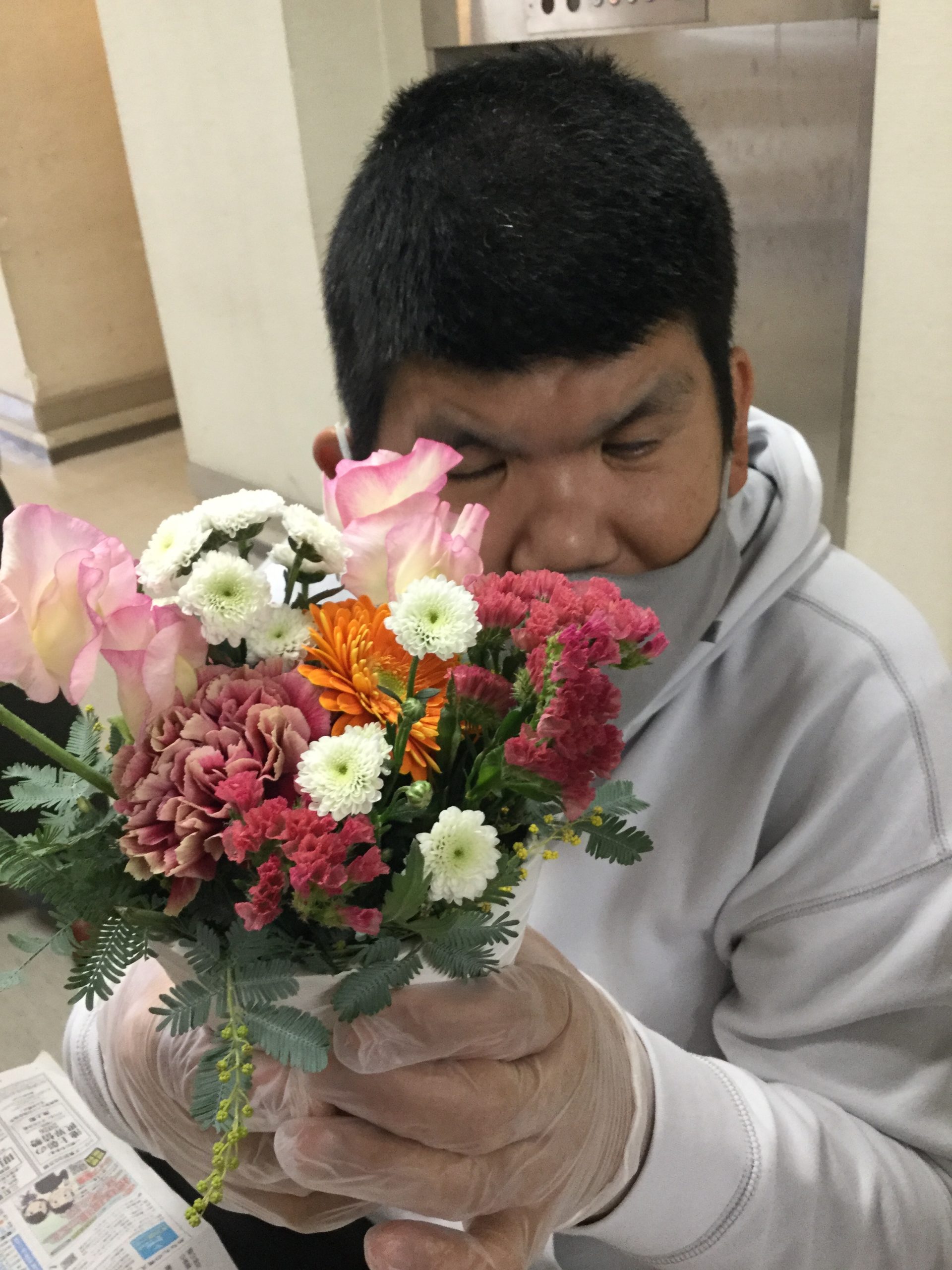 完成したフラワーアレンジメントをロビーに飾りました
